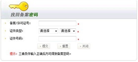 方式一:在线找回备案密码的操作(如果用户以前的联系资料不真实,无法收到密码,则不能通过此方法得到备案密码)